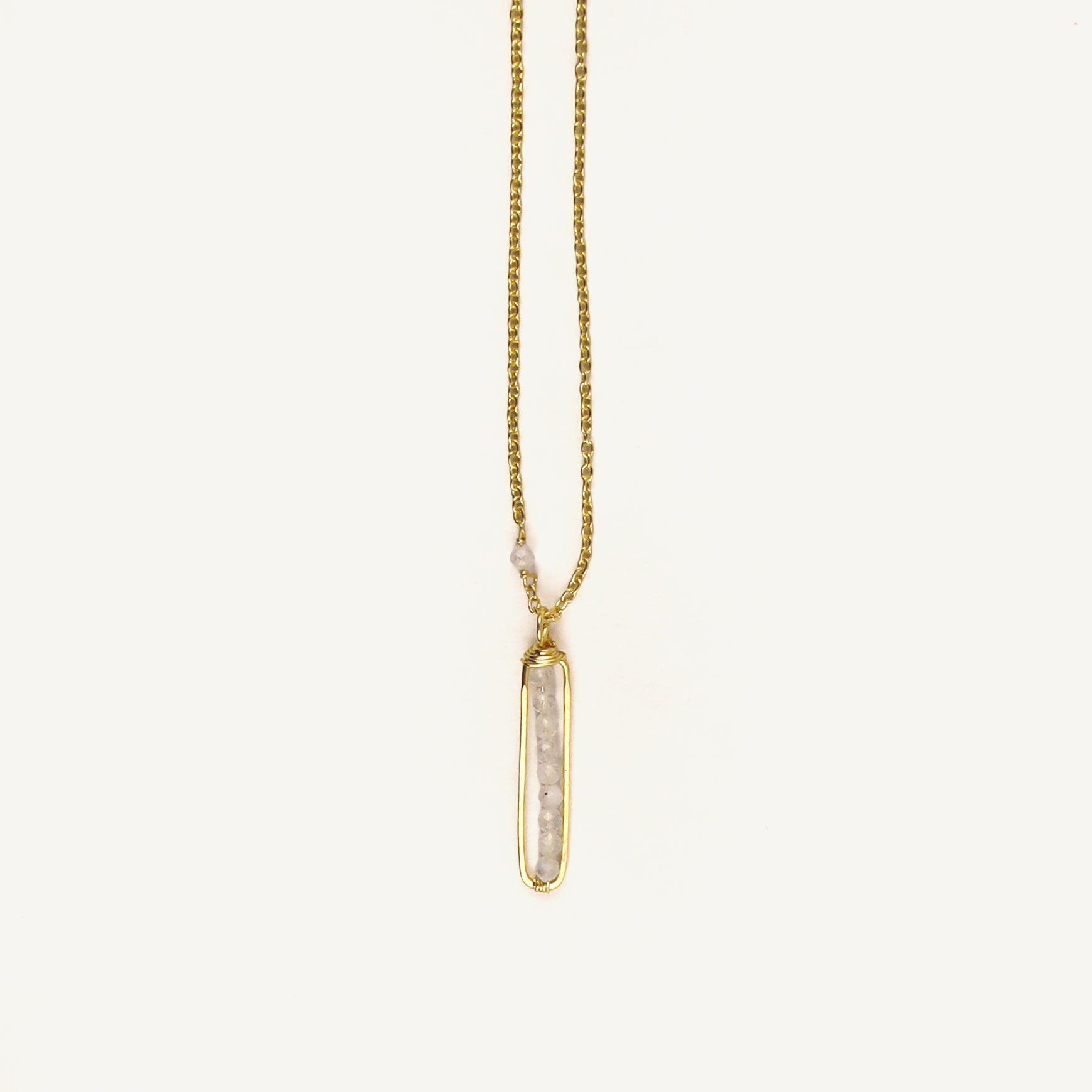 The Mallorca Necklace blends refined simplicity with natural radiance. Handcrafted in Rajasthan, this elegant piece features a vertical bar pendant of luminous, faceted moonstones—each one uniquely iridescent and softly colored. The pendant is set in .925 sterling silver plated with warm 18k gold and suspended from an adjustable chain for versatile styling at 16”, 17”, or 18”. Graceful and understated, the Mallorca Necklace layers beautifully or shines on its own, adding a gentle glow to any look.