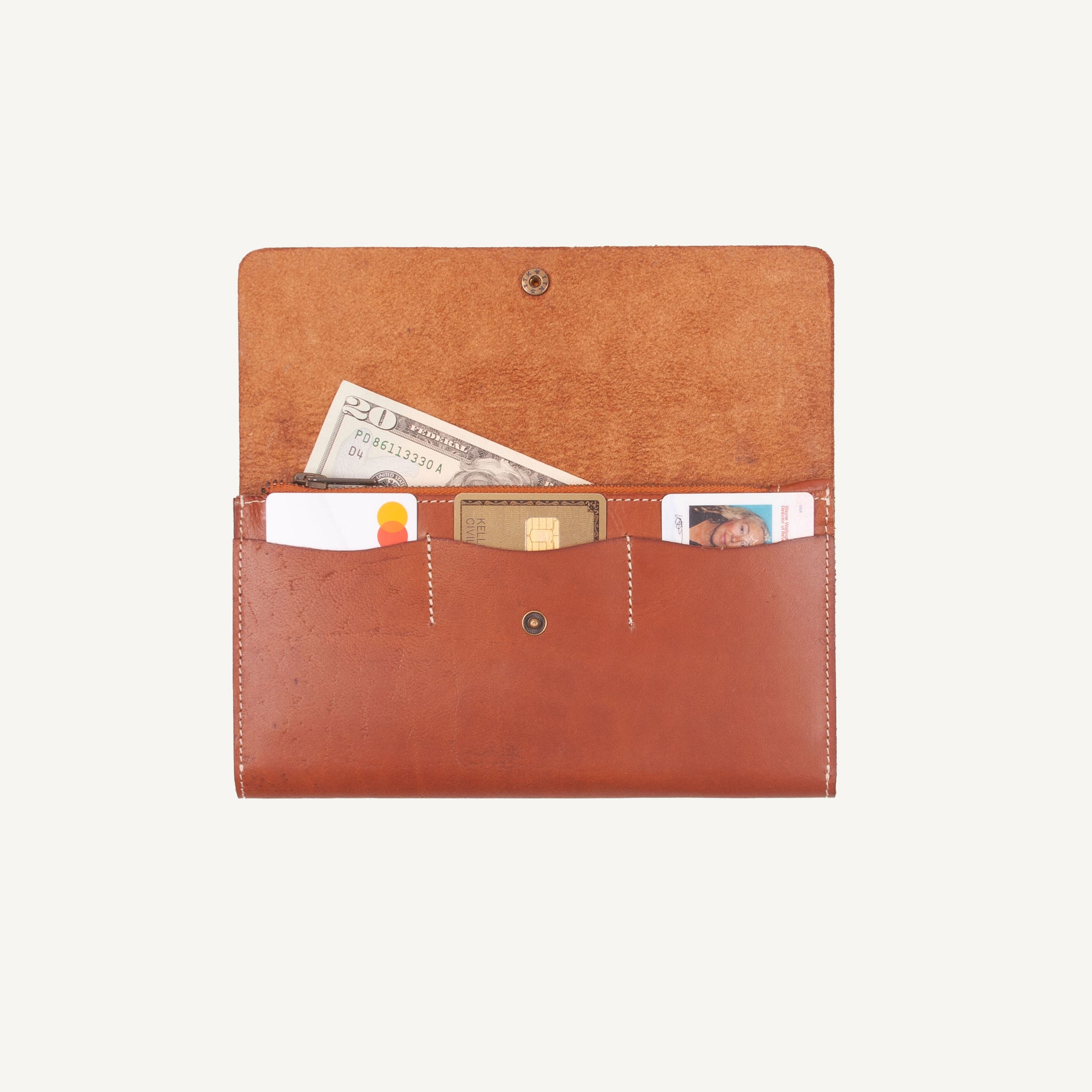 Both a wallet and a clutch, this full-grain leather piece is as functional as it is timeless. Designed with an interior brass zipper pocket, it offers room for your passport, ID, credit cards, and cash — making it the perfect companion for everyday use or travel. Each clutch is handmade from vegetable-tanned leather, and due to its artisanal nature, color and finish will vary beautifully from piece to piece.