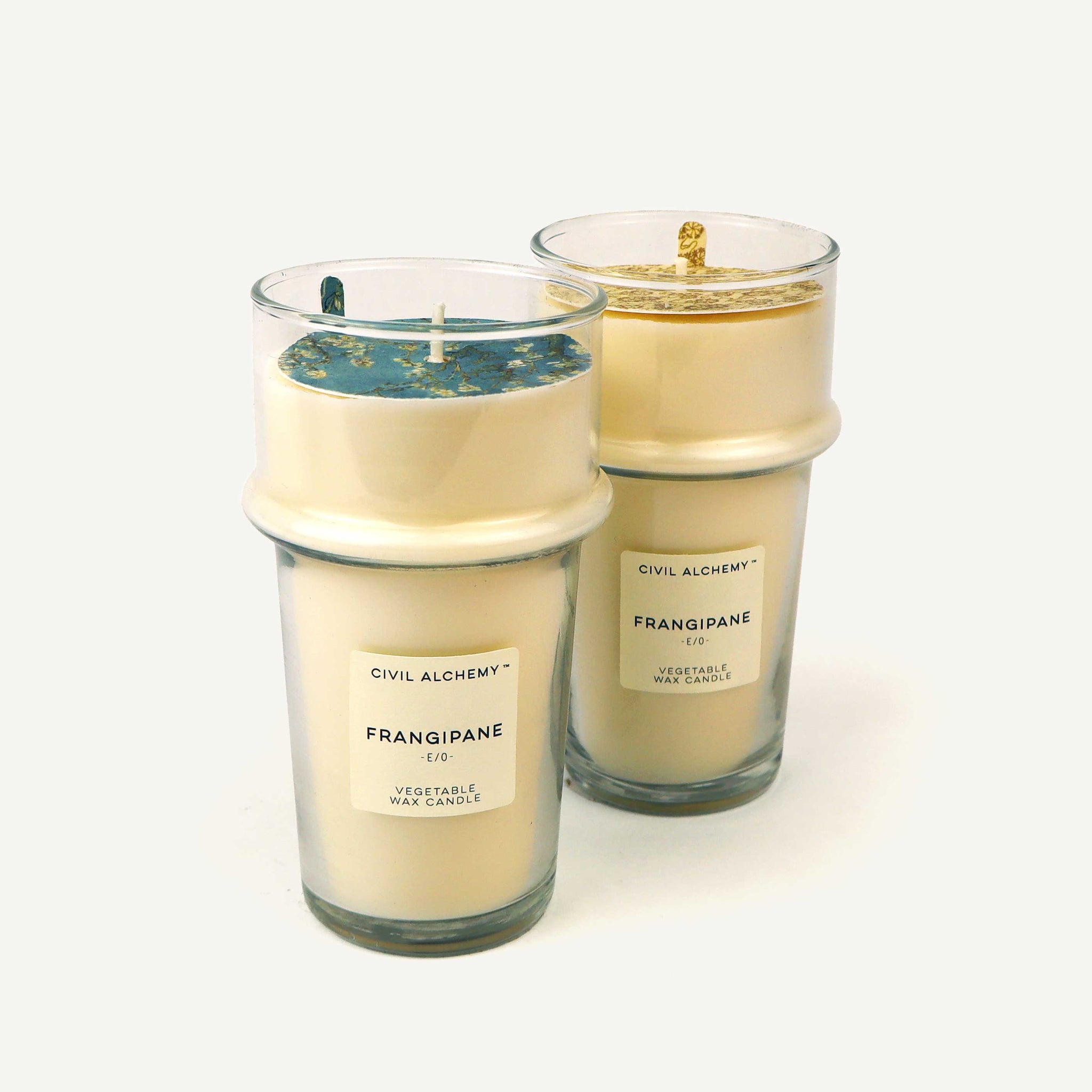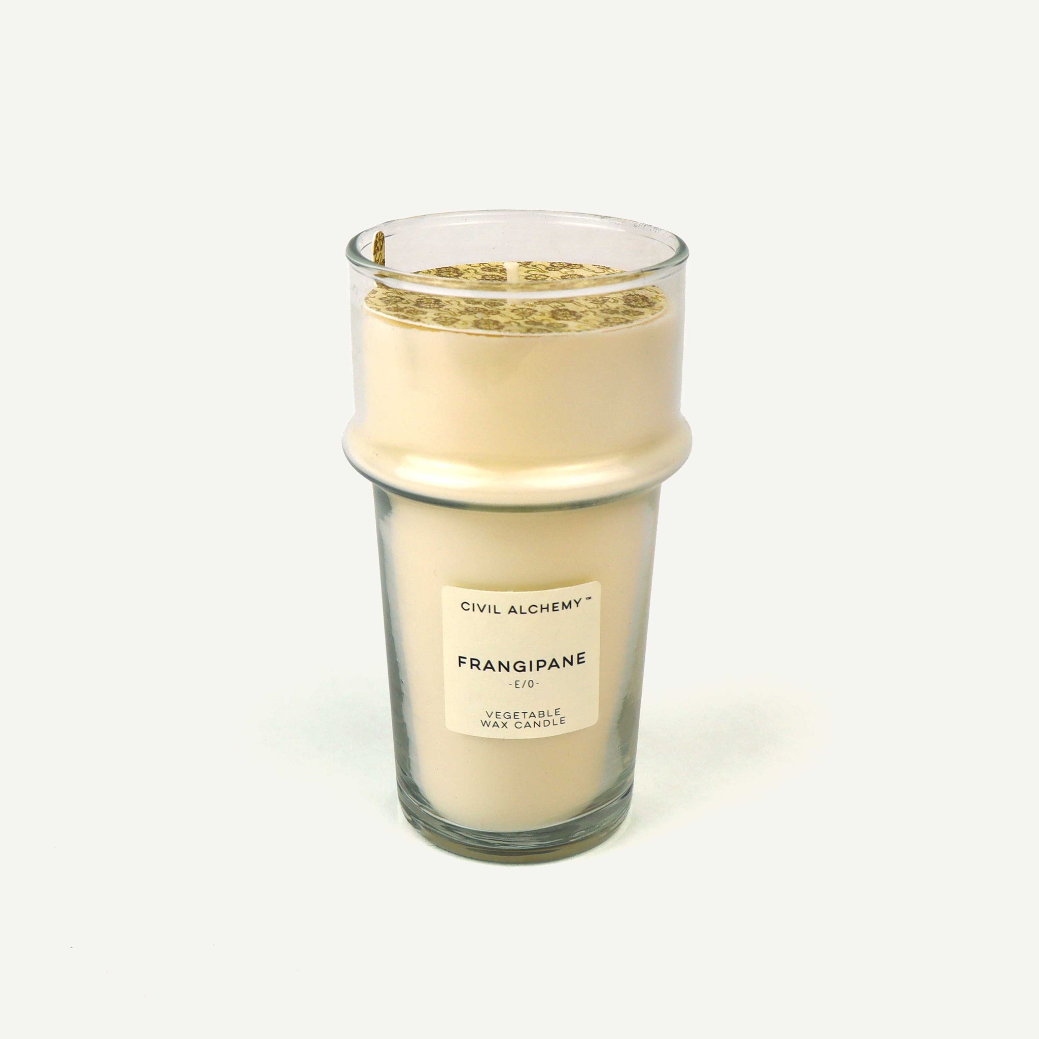 Candle labeled 'Frangipane' by Civil Alchemy on a white background
