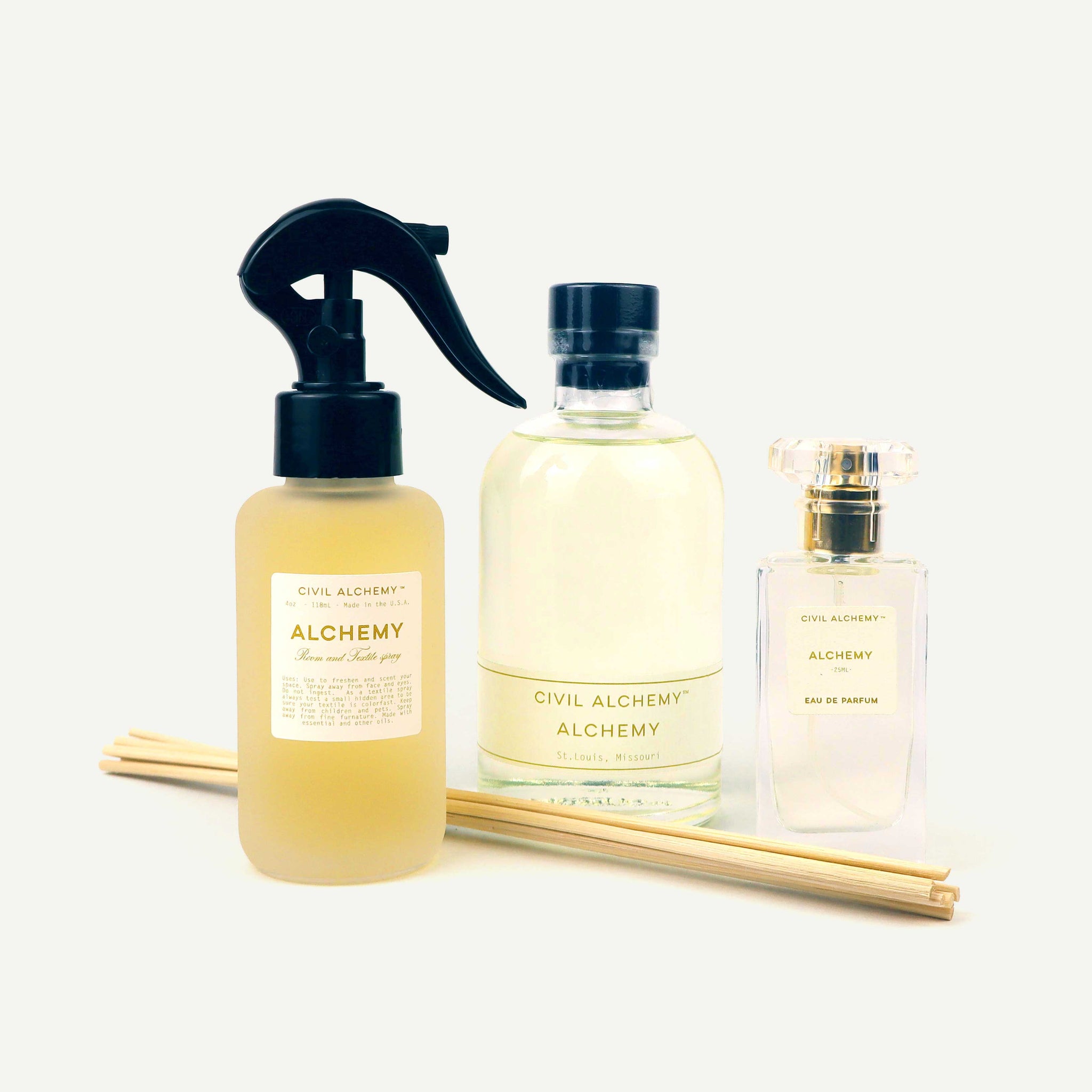 Three bottles of Civil Alchemy 'Alchemy' products on a white background