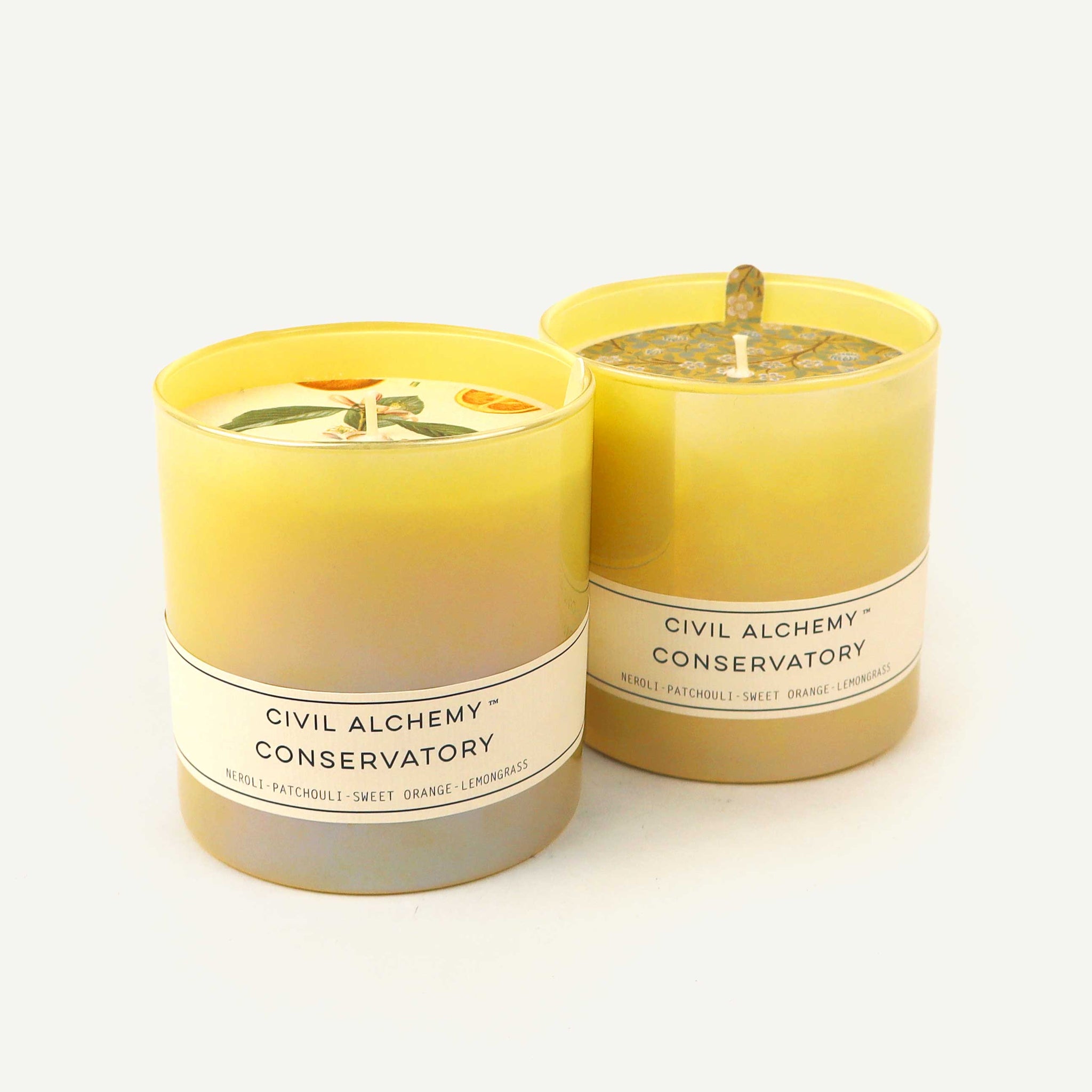 Conservatory Candle is a bright and balanced scent with citrus, floral, and herbaceous notes softened by a light powdery finish. Designed in-house and hand-poured in St. Louis, this candle blends neroli, lemongrass, sweet orange, cedar, patchouli, and almond for a fresh yet grounding fragrance. The 15 oz candle is made with a pure vegetable wax blend and poured into an iridescent glass container. Candle covers are selected at random.