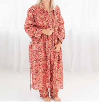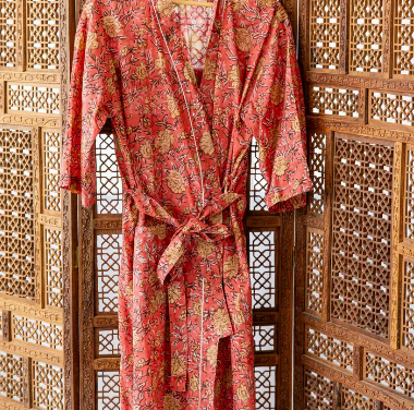 Beautiful gold and coral floral patterns adorn this effortless cotton robe. Featuring elaborate designs and vibrant hues, this robe combines elegance and comfort for a truly stunning look. Comfortably crafted from 100% cotton with intricate details from the wooden block printing. This artisan partner behind our coral and white robes has been providing jobs to families for more than 30 years and is renowned for its quality craftsmanship and generous employee policies. Hand wash or delicate cycle in cold water, hang to dry.