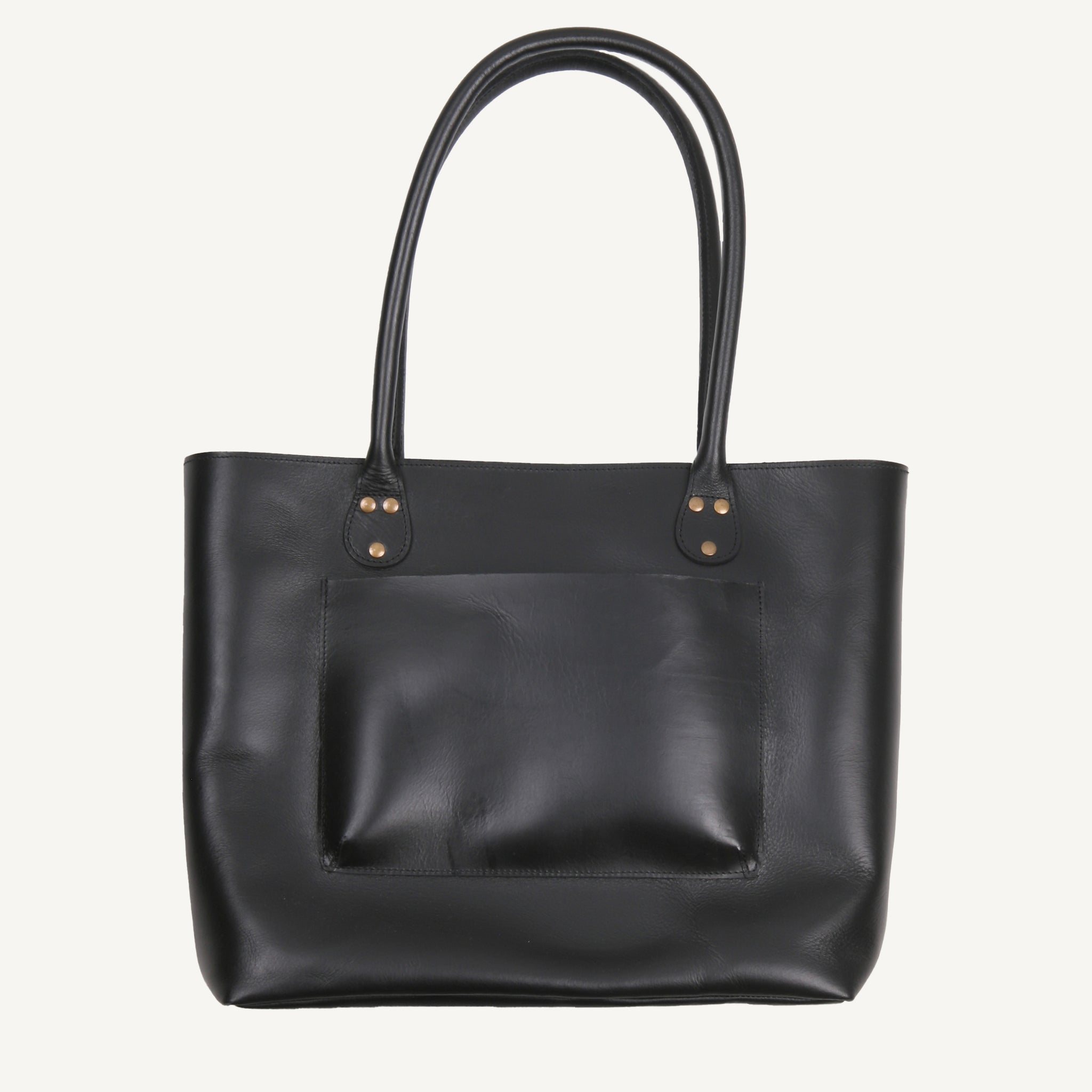 The Work Tote: a lined, sturdy tote built to handle your daily work needs. Crafted from top-grain leather and brass, it features a roomy side pocket for gear, riveted thick handles, and untreated leather that will age beautifully with use. Available in Black or Tan, this tote blends durability with timeless design.
