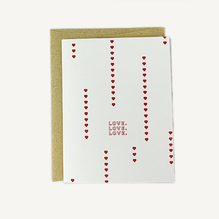 The Love Love Love Card by Civil Alchemy features “LOVE LOVE LOVE” letterpressed on the front with delicate heart designs. Each 80lb card is printed and scored by hand just blocks from our St. Louis shop. Includes a recycled French paper envelope and protective sleeve. Blank interior allows for personal messages.