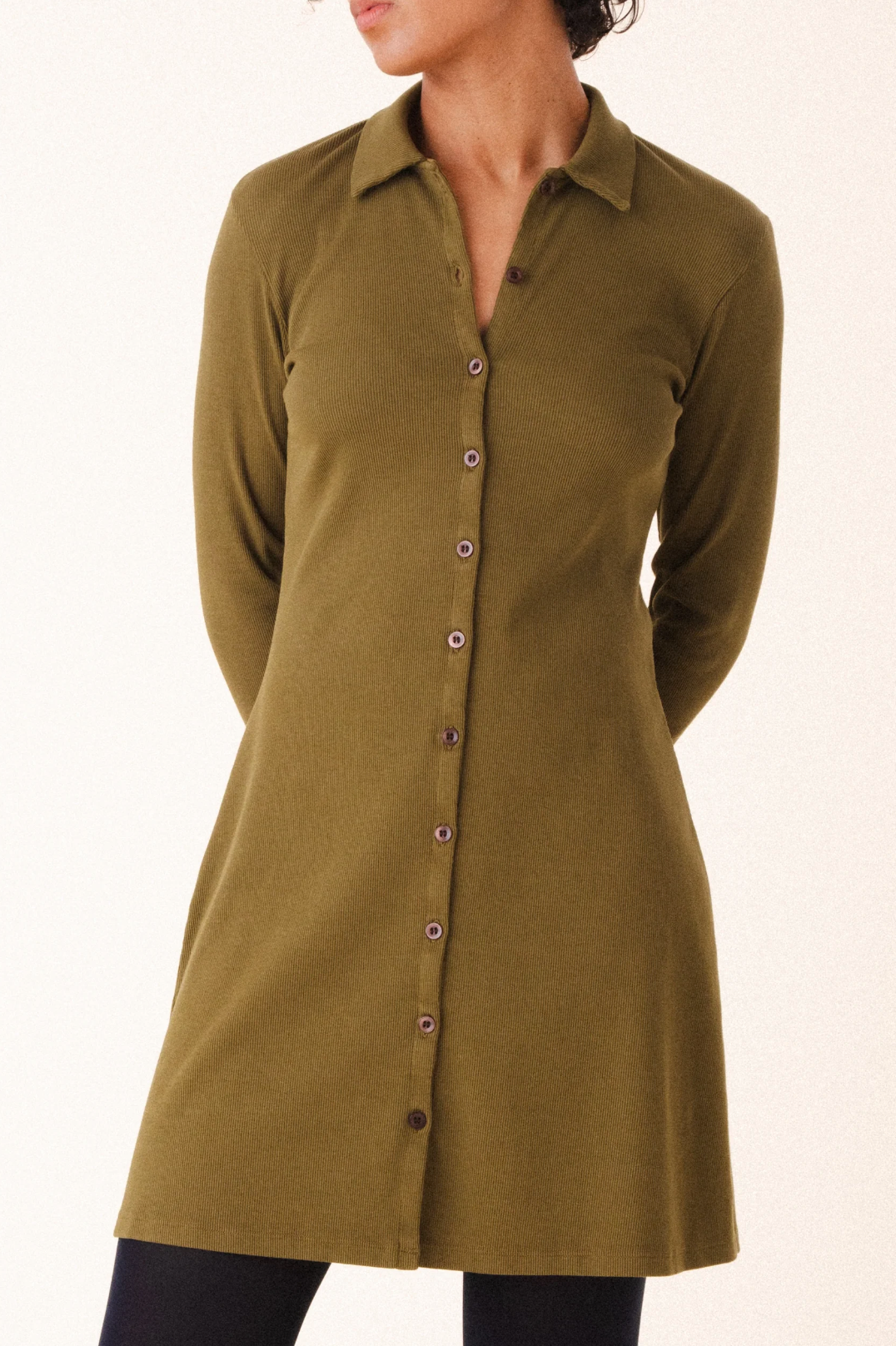 The body-skimming rules of equestrian style have been expanded in this thick rib button-down dress. Carefully placed buttons and long sleeves extend the seasonless possibilities for wear. Whether worn alone in late Summer or over jeans and tights in the winter, this dependable dress is poised and tailored and ready to style in a manner that suits your mood.