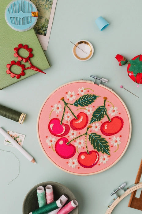 Rikrack Embroidery Cherries embroidery kit. Spring Cherry blossoms and bright shiny fresh picked cherries on pink background. Kit comes with everything you need to complete a 6 inch hoop. Rikrack kits are not only beautiful and unique but also fun and simple to stitch. Pre printed background makes it the perfect craft project for beginners and beyond. *Please note that color may slightly vary from how it appears in listing or packaging photos.