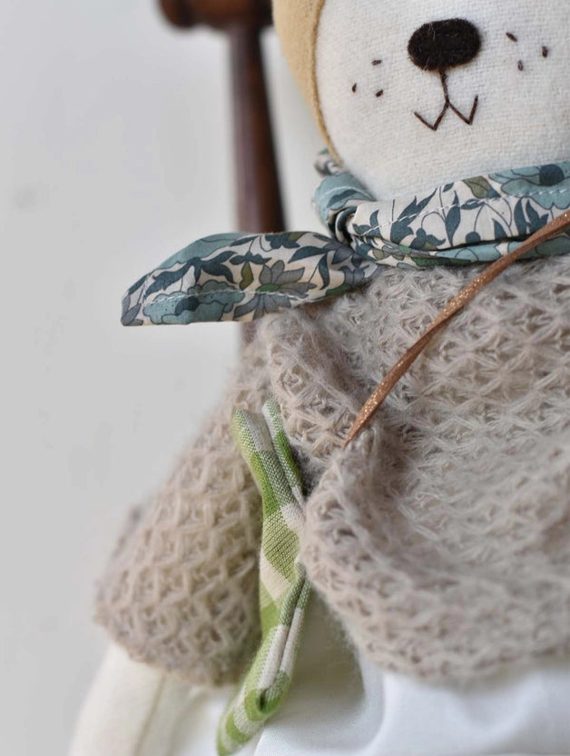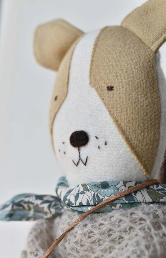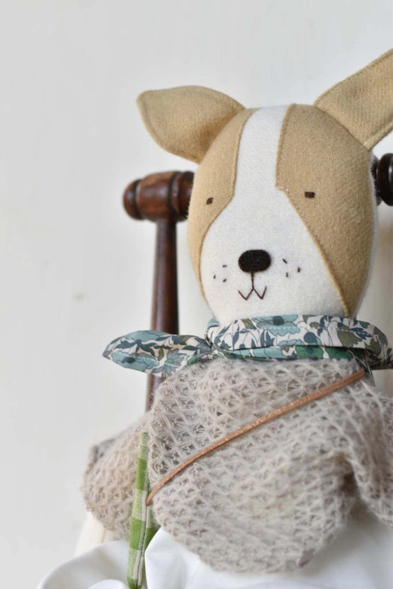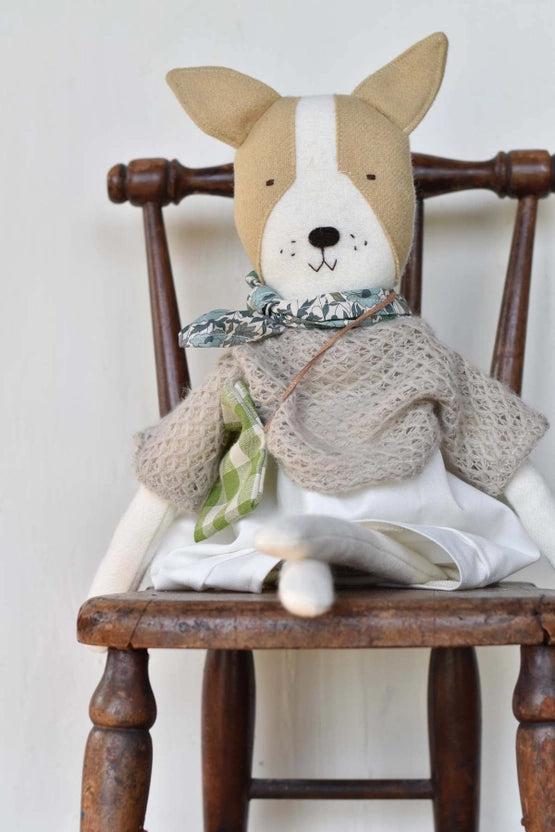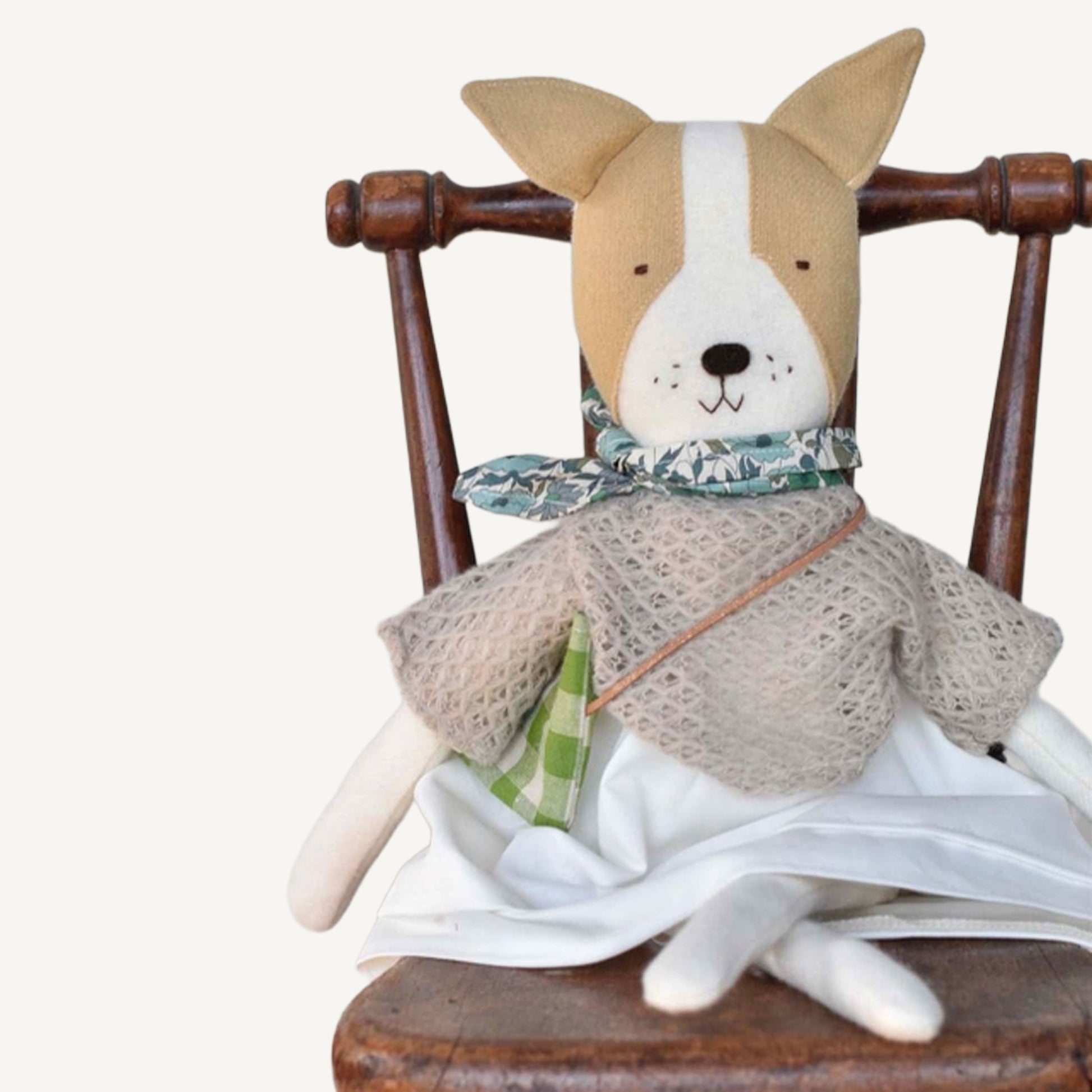The perfect stuffed dog doll. Our soft and plush woolen animals are handcrafted using 100% natural fibers sourced from American farms. They're durable, safe and eco-friendly! Each heirloom quality animal is designed to be loved for generations. Fig is wearing her oat sweater with a crisp white morning skirt. Fig carries a coordinating satchel with a leather cord strap to carry all of her treasures.