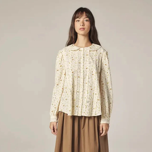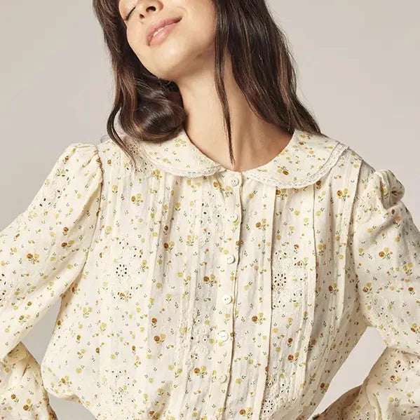 A gentle, refined shirt for the soft moments of transitional dressing. Crafted in lightweight, breathable cotton, this relaxed-fit button-down features a signature Peter Pan collar edged with delicate lace, evoking quiet romance and thoughtful simplicity. A muted floral print in warm yellow and olive tones dances across the ivory ground, lending a subtle, artisan touch to everyday wear. Thoughtfully detailed with tonal buttons and gentle pintucks at the front, the silhouette falls with easy grace — both tucked and untucked. Eyelet embroidery and lace insets across the bodice and back yoke offer a vintage-inspired charm without excess, making this shirt both poetic and poised. Soft Peter Pan collar with lace trim Full button placket with tonal buttons Lightweight cotton for breathable comfort Mini floral motif in warm, earthy tones Eyelet embroidery and lace panel accents Relaxed silhouette with subtle shaping
