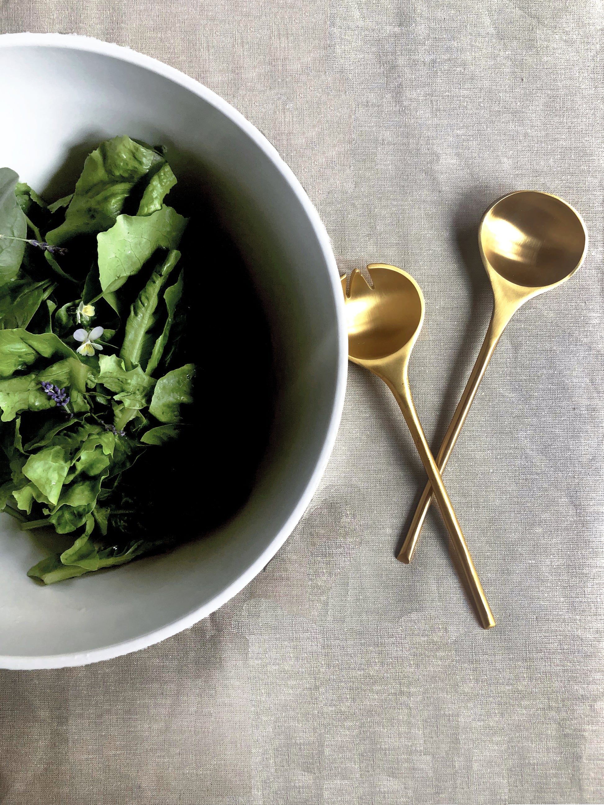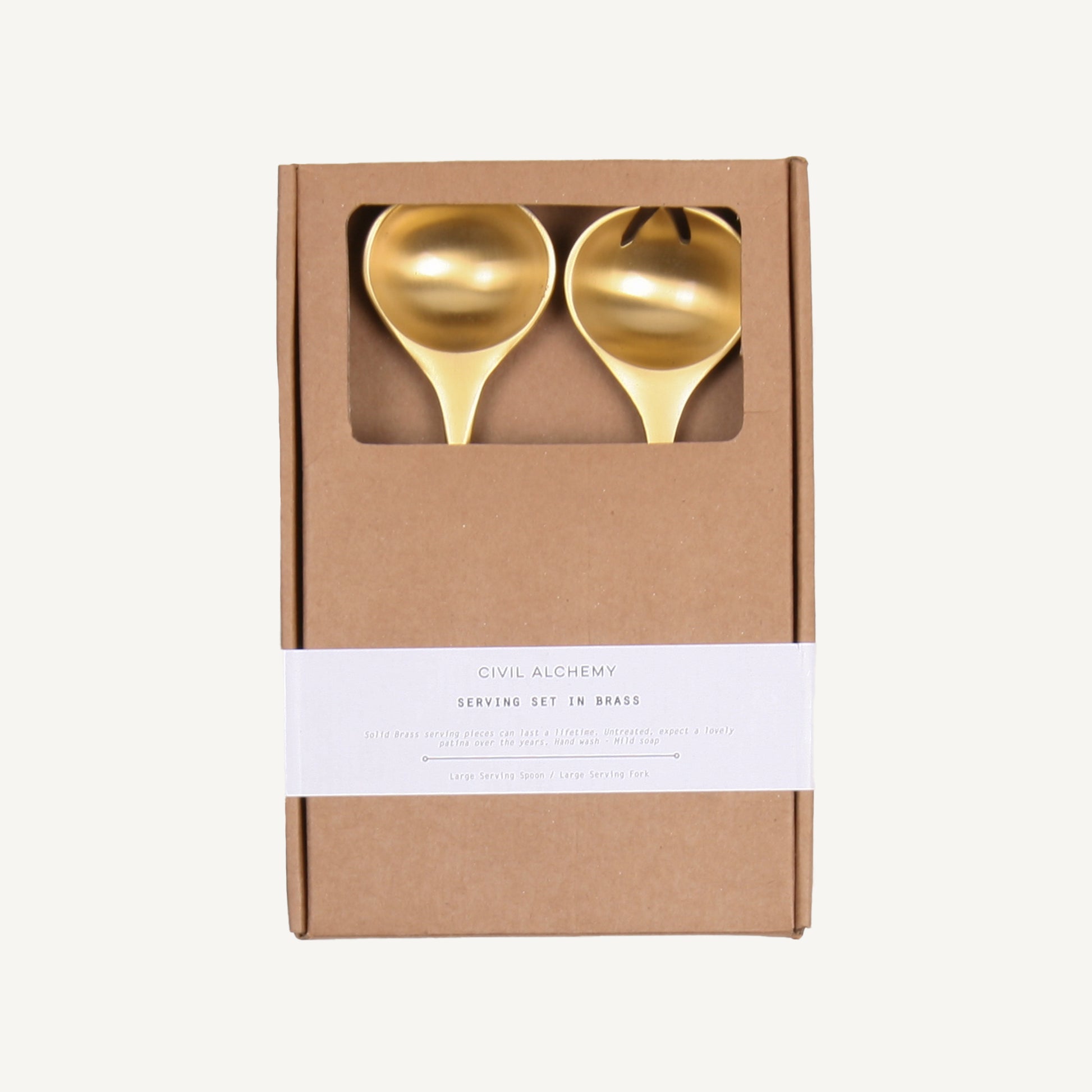 A simple and lasting addition to the table, this brass Serving Set includes a spoon and fork designed for both function and beauty. Cast in India, each piece is solid brass with an unlacquered finish that will develop a natural patina over time. Suitable for salads or side dishes, these timeless tools grow better with age.