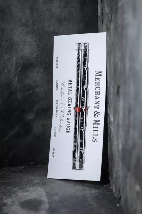 A metal gauge with sliding pointer for hem and seam allowance consistency. A great time saving device. Set it to the desired length, measure and mark, and you're done.