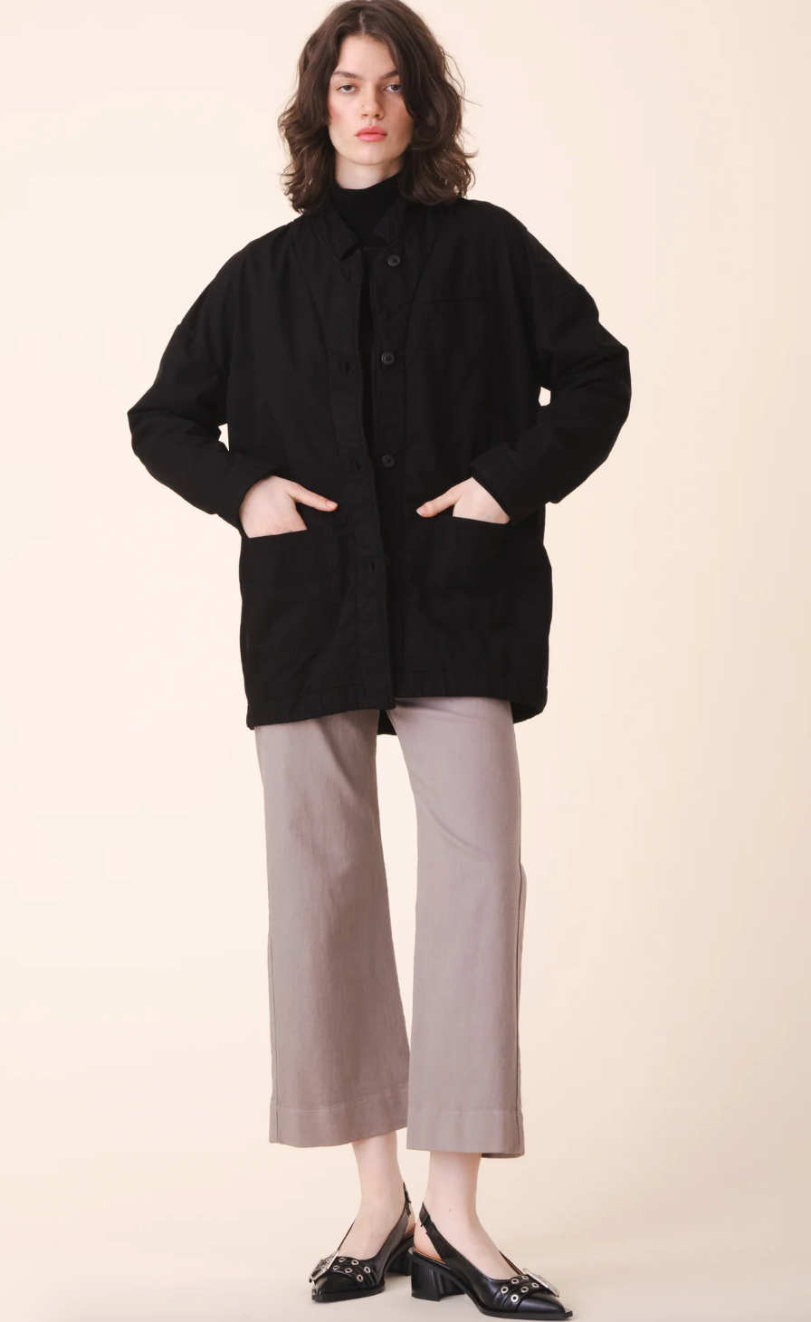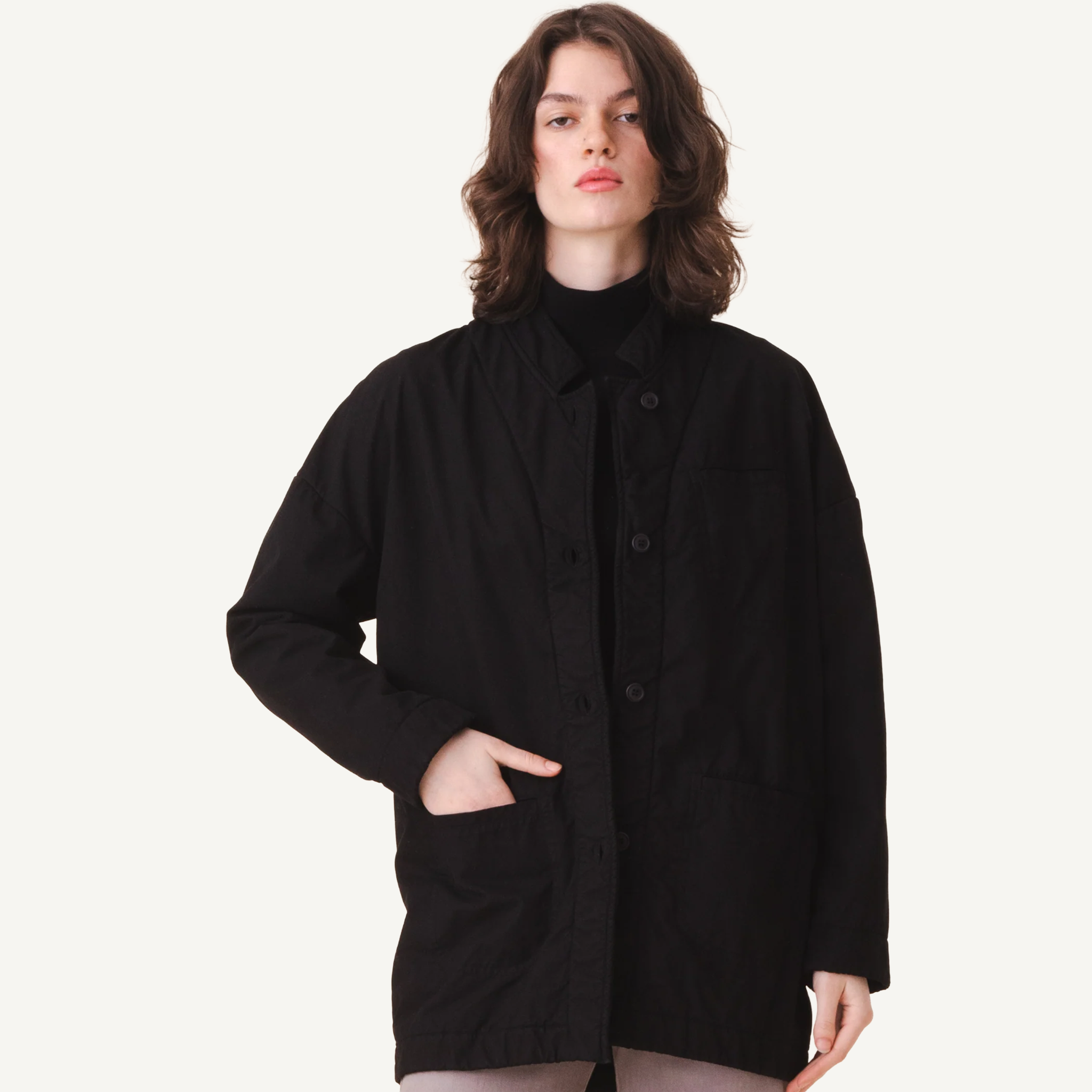 – Front button closure – High neckline with button at lapel – Three functional welt pockets – Oversized and cocoon shaped – 100% Cotton shell, lining is 100% Organic Cotton fleece grown and knit in the USA – Made in Seattle, U.S.A.